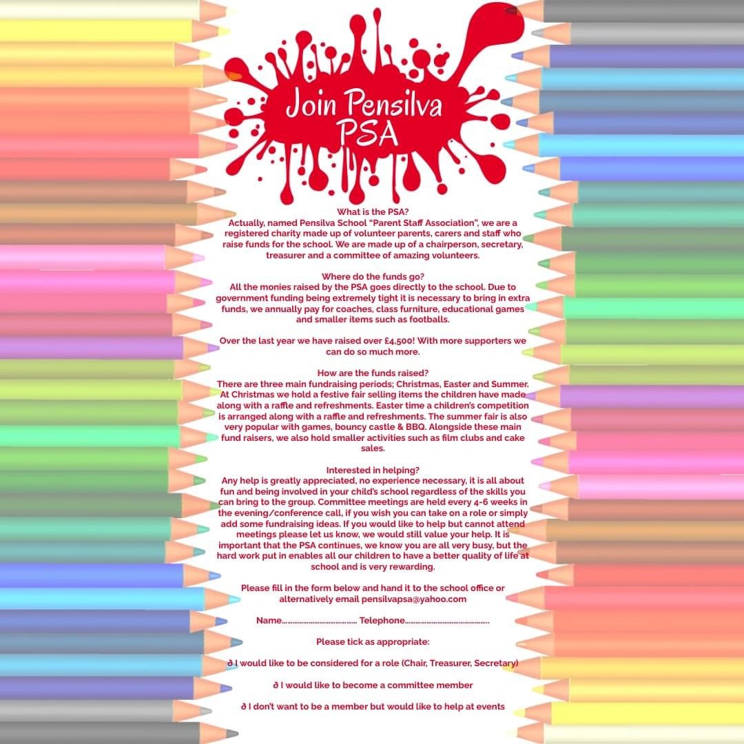 Actually named the Pensilva School Parent Staff Association we are a registered charity made up of volunteer parents/carers and staff who raise funds for Pensilva School. At the annual general meeting in October we nominate a Chairperson, Secretary, and Treasurer and have a committee of willing volunteers.